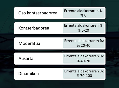 | Profil erabilgarriak | Oso kontserbadorea Kontserbadorea Moderatua Ausarta Dinamikoa | Oso kontserbadorea Kontserbadorea Moderatua Ausarta Dinamikoa |